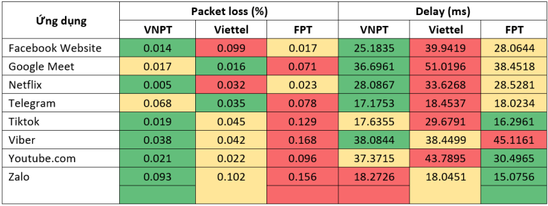 Ghi chú:  Số liệu tổng hợp từ kết quả đo kiểm Benchmarking tại 63 T/TP trên hệ thống đo kiểm tập trung CTS. Màu xanh: xếp hạng 1; Màu vàng: xếp hạng 2; Màu đỏ: xếp hạng 3.